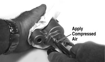 6.Cover the piston end of the housing with a shop towel; then keeping fingers clear of piston travel, apply compressed air to the fluid port to blow the piston free of the housing. Account for two seal rings in the housing.