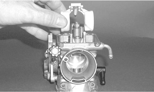 5.Place the jet needle, spring seat, and spring into the vacuum piston; then place the assembly down into the carburetor. 6.Place the top cover into position; then secure with the Phillips-head screws. Tighten securely.