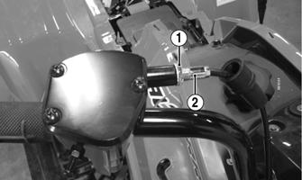 To adjust throttle cable free-play, use the following procedure. 1.Slide the rubber boot away from the adjuster; then loosen the jam nut (1) from the throttle cable adjuster (2).