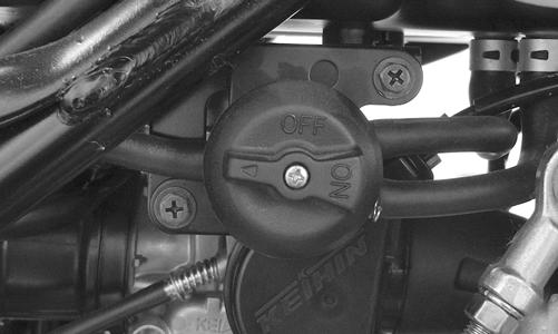 The ATV has a valve attached to the gas tank. There are three positions: ON, RES, and OFF.