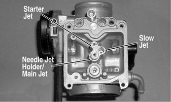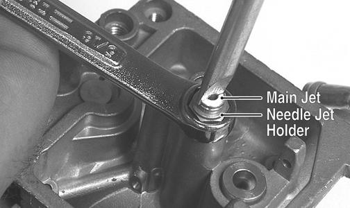 7.Remove the needle jet holder; then remove the needle jet, slow jet, and the starter jet. CLEANING AND INSPECTING ! WARNING