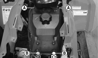 5.Cut the tie-down securing the gas hose to the cables and hoses. 6.Remove the cap screws (A) and nuts (B) securing the gas tank to the frame.