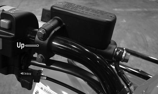 INSTALLING 1.Install the brakelight switch on the master cylinder; then install the brake lever and brake lever lock. 2.Install the master cylinder assembly on the handlebar engaging the alignment stud in the hole in the handlebar; then secure with the master cylinder clamp and two cap screws. Make sure the UP arrow on the clamp is directed upward.