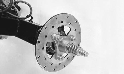 2.Compress the brake lever and engage the brake lever lock; then remove the rear wheels and hub caps. 3.Remove the cotter pins and rear hub nuts; then remove the hubs. 4.Disengage the brake lever lock; then remove the rear brake calipers and brake disc. NOTE: Do not apply the brakes with the calipers