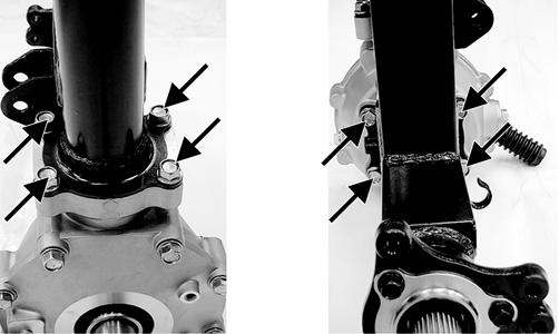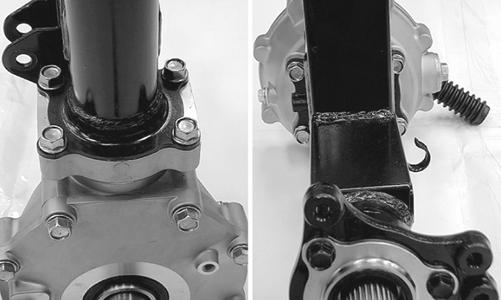 2.Install the rear axle and gear case into the right side of the swing arm; then secure the gear case to the swing arm assembly with the eight cap screws.