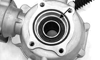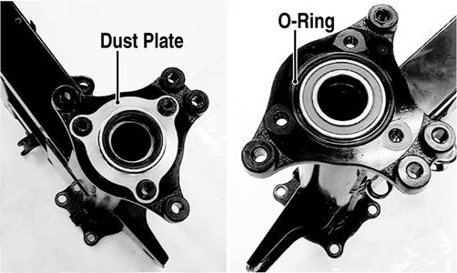 4.Using a suitable bearing driver, install the new axle bearing into the axle housing; then install the O-ring and dust plate. Tighten the three cap screws securely.