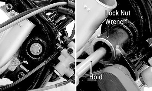7.Install the right pivot bolt and left pivot adjusting bolt and tighten securely; then move the swing arm up and down to seat the bearings. Tighten the left pivot bolt to 36 in.-lb and the right pivot bolt to 82 ft-lb. 8.Install the left pivot lock nut; then while holding the left pivot adjusting bolt, use Pivot Lock Nut Wrench to tighten the lock nut to 82 ft-lb.
