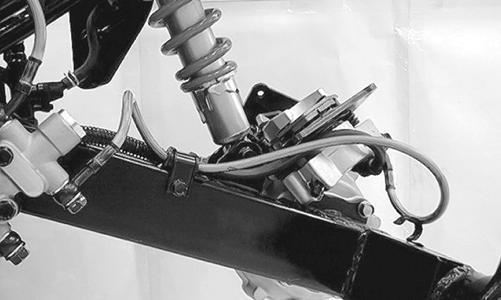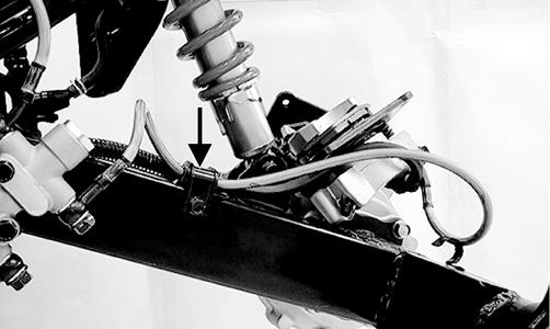 9.Install the shock absorber using the existing hardware and tighten to 29 ft-lb; then install the brakeline hose clamp on the swing arm and tighten securely.