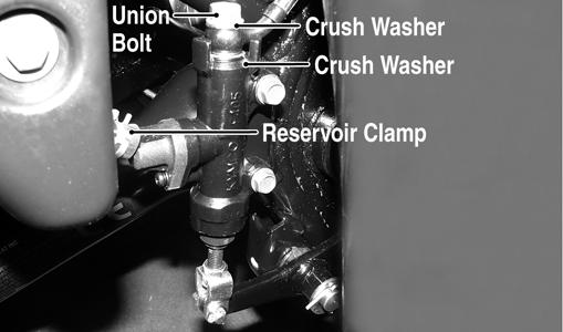 2.Compress the reservoir clamp and remove the reservoir hose; then remove the union bolt. Account for and discard two crush washers.