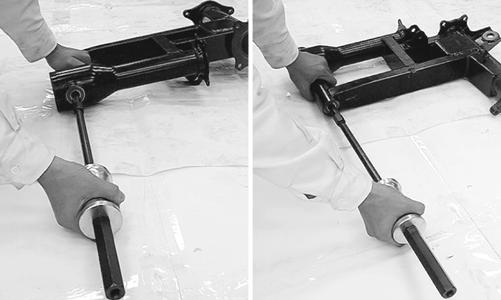 13.Support the swing arm from the right side; then using a rubber mallet, drive the axle shaft from the swing arm tube. Account for two O-rings.