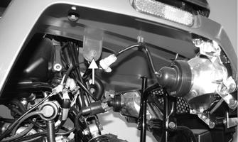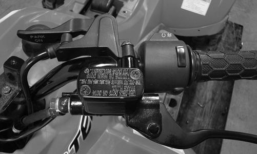 7.Install the hydraulic hand brake assembly to the handlebar and secure with the cap screws. 8.Connect the brakelight switches and handlebar switch connectors. 9.Install the handlebar cover with two cap screws and push pin (DVX), and connect the one 4-pin connector and two 2-pin connectors. Connect both 2-pin headlight connectors. 10.Install the footwells with the Phillips-head screws and cap screws. 11.Route the CDI connector, main relay, and main fuse case through the plastic and connect the CDI unit.