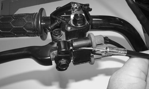 10.Remove the two Phillips-head cap screws securing the throttle cable cover to the housing; then remove the throttle cable. 11.Remove both brake cables from the right side of the handlebar. Match-mark both cable locations.