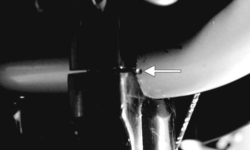 5.Place a suitable container beneath the left-hand brake master cylinder. 6.Remove the brakeline hose bolt; then drain brake fluid into the container. Account for two crush washers.