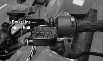 6.Remove the cover from the master cylinder and fill with DOT 4 brake fluid; then install the cover. 7.Place a suitable container under the master cylinder and compress the lever slowly. Brake fluid should flow from the loose connection. 8.Tighten the brakeline hose bolt to 20 ft-lb (from step 5); then check the rear brake operation. The brake lever should be firm and the rear brake should stop the wheels.