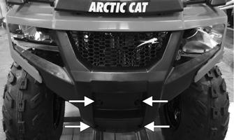 3.Install the remaining main body caps screws (two cap screws from under the front fenders, two cap screws from under the rear fenders). Secure the front fascia to the frame. Tighten the cap screws and the cap screws from step 4 to 86 in.-lb. 4.On the Alterra 90, install both front and rear racks; then secure with the cap screws. 5.Align the handlebar and install both handlebar clamps; then secure with the Allen-head cap screws and tighten to 10 ft-lb.