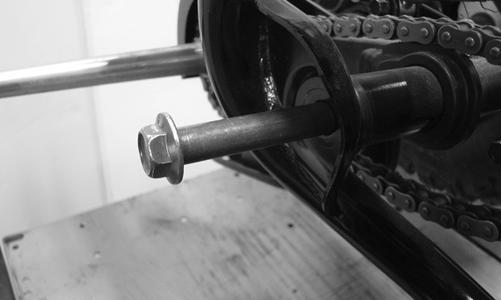 5.Install a new self-locking nut. Tighten the nut to 50 ft-lb. 6.Install the axle, spacers, hubs, and drive chain (see
