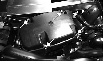 1.Remove any dust and debris from around the filter housing. 2.Unsnap the four spring-clip fasteners and remove the air filter cover.