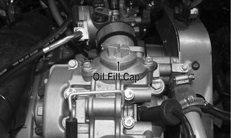 6.Start the engine (while the vehicle is outside on level ground) and allow it to idle for a few minutes. 7.Turn the engine off and wait approximately one minute; then unscrew the oil level stick and wipe it with a clean cloth. 8.Install the oil level stick and thread into the engine case. 9.Remove the oil level stick; the oil level must be within the operating range but not exceeding the upper mark.