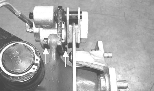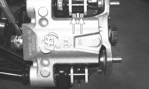 3.If thickness of either brake pad friction material is less than 1.0 mm (0.039 in.), the brake pads must be replaced. NOTE: The brake pads should be replaced as a set. 4.To replace the brake pads, use the following procedure. A.Remove the cap screws securing the caliper holder to the knuckle; then remove the pads from the caliper.