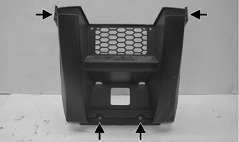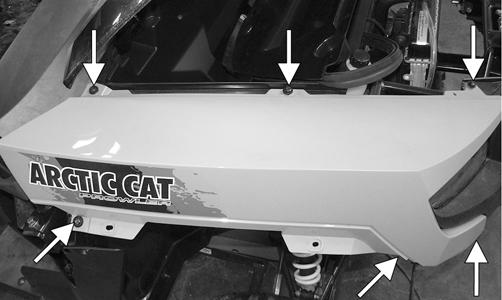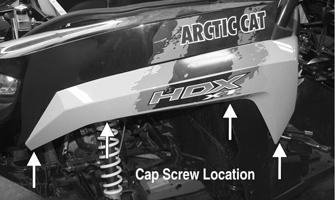 REMOVING 1.Remove the four cap screws securing each outer fender to the corresponding inner fender; then remove the fenders. 2.Remove the push pins securing the front access panel. Tilt the access panel back to access the inner fender fasteners.
