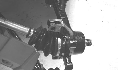 2.Remove the nut securing the hub. 3.Remove the brake caliper. 4.Remove the hub assembly. 5.Remove the cotter pin from the tie rod end and remove the tie rod end from the knuckle. 6.Remove the two cap screws securing the ball joints in the knuckle.
