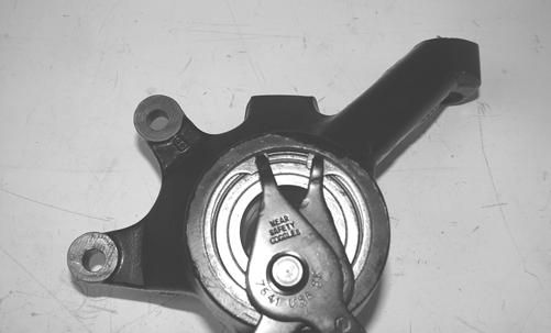 7.Tap the ball joint end out of the knuckle; then remove the knuckle. 8.Remove the snap ring securing the bearing in the knuckle; then press the bearing out of the knuckle.