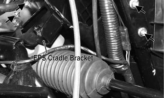 INSTALLING RACK AND PINION 1.From the left side, install the steering assembly (rack and pinion) to the frame assembly and secure with two cap screws. Tighten to 35 ft-lb. 2.Install the EPS cradle bracket and secure with four cap screws. Do not tighten the cap screws at this time.