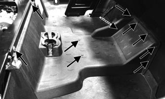 6.Repeat steps 4-5 for the right side. 7.Remove the remaining cap screws and self-tapping screws securing the floor board to the frame. 8.While pulling forward on the upper-rear of the floorboard, lift the rear part of the floor above the seat locating stud.