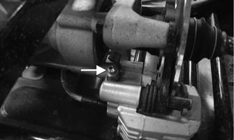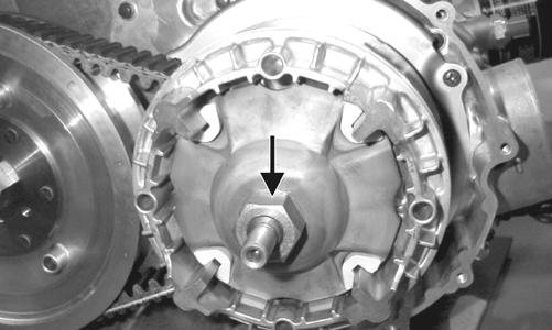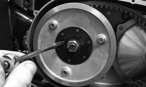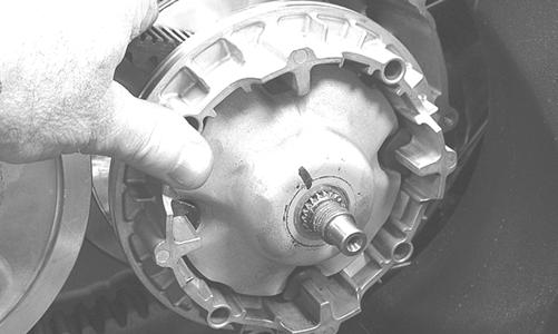7.Install a fully threaded 6 x1 mm cap screw into the driven pulley fixed face; then turn the cap screw clockwise to spread the pulley faces. Remove the Vbelt.