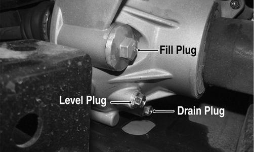 4.After all the lubricant has been drained, install the drain plugs and tighten the front to 23 in.-lb and rear to 15 ft-lb. 5.Pour the appropriate amount of recommended lubricant into the fill hole. 6.Install the fill plugs and tighten the front to 25 ft-lb and the rear to 11 ft-lb.