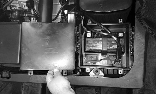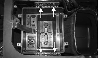2.Remove the battery by disconnecting the negative cable first then the positive cable. Move the starter relay and cables up out of the way. Remove the four cap screws securing the battery box to the frame.