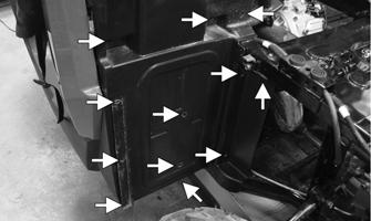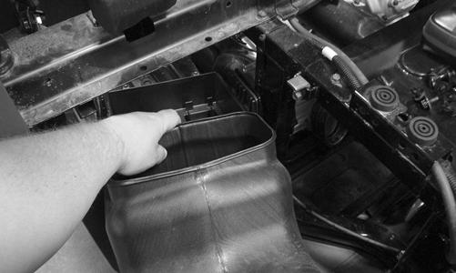5.Install the battery box and storage compartment into the frame. Secure the battery box to the frame; then position the exhaust duct in place. Secure with the cap screw and clamp. 6.Install the left rear splash panel. 7.Install the battery and starter relay. Connect the positive cable first then the negative cable; then install the battery box cover and seat.