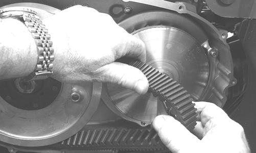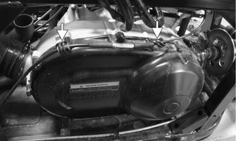3.With the vehicle in neutral, rotate the V-belt and clutches counterclockwise until the V-belt is flush with the top of the driven pulley. 4.Place the CVT cover gasket and dowel pins into position. Note the position of the throttle cable routing and clamps; then install the cover and secure with the cap screws making sure the differentlengthed cap screws are in their proper location.