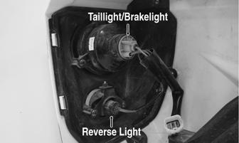 4.Remove the taillight/brakelight socket by rotating the socket counter-clockwise. Rotate the bulb counter-clockwise to remove from socket. 5.Remove the reverse light housing by removing the two screws and nut; then remove the two machine screws. Rotate the bulb counter-clockwise to remove from socket.