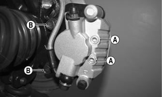 A.Loosen the brake pad retaining pins (A); then remove the cap screws securing the caliper holder to the knuckle (B). Remove the retaining pins and pads from the caliper.