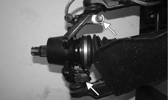 2.Remove the cotter pin and nut securing the hub. 3.Remove the brake caliper. 4.Remove the hub assembly; then remove the brake line from the knuckle. 5.Remove the cotter pin from the tie rod end and remove the tie rod end from the knuckle. Account for the washer. 6.Remove the two cap screws securing the ball joints in the knuckle.