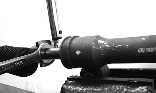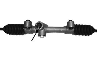5.Install the boot onto the rack and secure with the nylon tie. 6.Center the rack in the steering rack assembly and align the white paint line on the pinion with the mark on the rack housing.