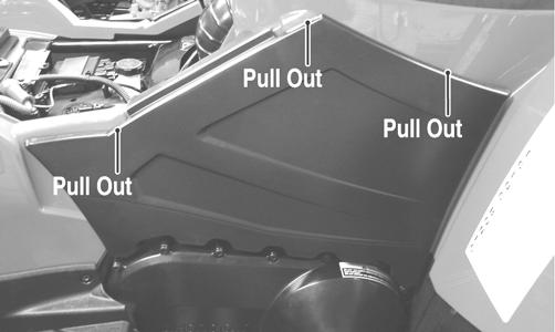 2.Remove two cap screws, two self-tapping screws, and three nylon ties securing the left-side splash panel and remove the panel. 3.Remove the axle and nut securing the shift lever to the upper shift arm; then remove the shift lever.