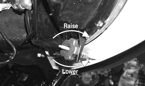 6.Observe each headlight beam aim. Proper aim is when the most intense beam is centered on the vertical mark 5 cm (2 in.) below the horizontal mark on the aiming surface. 7.Adjust each headlight by turning the adjuster knob clockwise to raise the beam or counterclockwise to lower the beam.