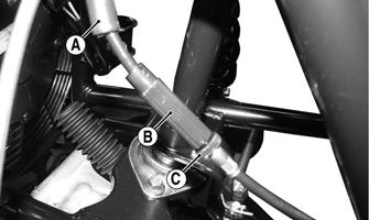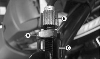 3.Adjust the cable. The main cable adjuster is located within the front left wheel well. Pull the rubber cover (A) away, loosen the jam nut (B), and turn the adjuster (C).