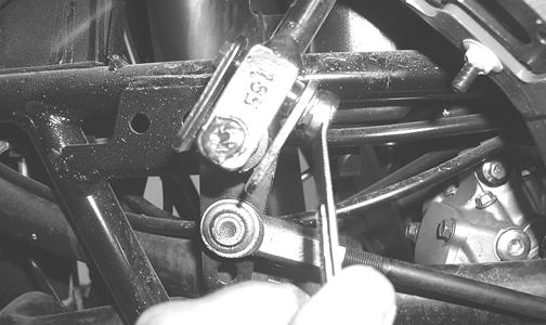 INSTALLING 1.Place the spring into position between the upper shift arm and shift lever; then making sure the O-rings are in place on the axle, secure the shift lever to the arm with the existing axle and nut. 2.Place the shift rod into position on the shift lever and secure with the existing E-clip. 3.Check shift lever adjustment (see Periodic Maintenance/Tune-Up); then tighten jam nut(s) securely. 4.Install the left-side splash panel.