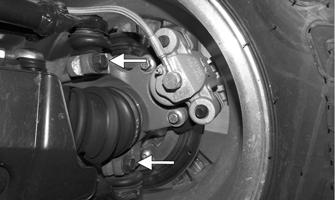11. Install the wheel; then using a crisscross pattern, tighten the wheel nuts in 20 ft-lb increments to a final torque of 40 ft-lb (steel wheel), 60 ft-lb (aluminum wheel w/black nuts), or 80 ft-lb (aluminum wheel w/chrome nuts). 12.Remove the ATV from the support stand.