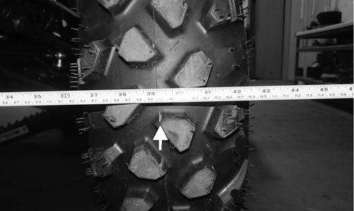 5.Mark the center line of the front tires at the front and the rear of the tire; then using a tape measure, measure and record the distance between the marks at the front and rear. The front measurement should be 3-6 mm (1/8-1/4 in.) greater than the rear measurement (toe-out).