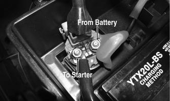 Secure with two machine screws and wiring forms. 2.Secure the positive cable to the starter with the nut. 3.Connect the battery. Positive cable first, then negative.