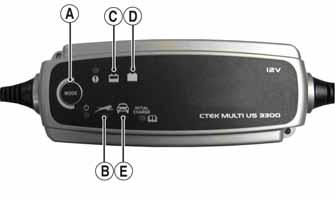 6.If using the CTEK Multi US 800, there are no further buttons to push. If using the CTEK Multi US 3300, press the Mode button (A) at the left of the charger until the Maintenance Charge Icon (B) at the bottom illuminates. The Normal Charge Indicator (C) should illuminate on the upper portion of the battery charger.