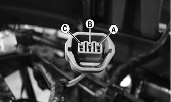4.With the switch connected to the harness, connect the red meter lead to the red/black wire and the black meter lead to ground; then turn the ignition switch to the ON position. The meter must show battery voltage. 5.Connect the red meter lead to the yellow/green wire; then with the black meter lead grounded, turn the ignition switch to the START position. The starter should engage and the meter must show battery voltage. NOTE: When the starter is engaged, battery voltage