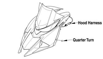 REMOVING 1.Rotate the two quarter-turns to the vertical position; then pull the top of the side panel out and up and off the skid plate. 2.Disconnect the hood harness on the left-side of the hood; then loosen the two quarter-turns securing the front of the hood. Pull the hood forward and remove the hood.