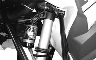REMOVING 1.Position the front of the snowmobile on a safety stand taking all pressure off the skis. 2.Remove the cap screws securing the shock absorber to the chassis and the lower A-arm; then remove the shock absorber. Account for all mounting hardware.