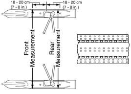 7.Measure the distance from the straightedge to the right-side ski wear bar bolts in two places: 7-8 in. in front of the spindle and 7-8 in. behind the spindle.