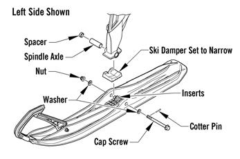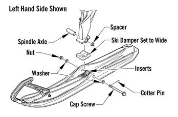 INSTALLING 1.Slide a washer onto the cap screw used to secure the ski; then apply low-temperature grease to the shaft portion of the cap screw and spindle axle. 2.Install the spindle axle into the spindle; then position the ski damper into the bottom of the ski making sure the damper is properly positioned for the desired ski stance.
